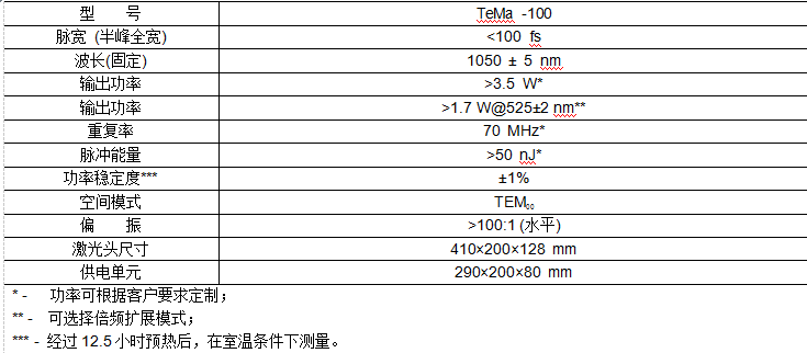 TeMa-100型掺镱激光器能够辐射波长在1 ??附近的高功率激光,如同使用全固态Ti:S激光器辐射波长>1 ??的额定功率激光。具有二极管泵浦模块集成化、系统稳定性高、操作简洁等特点。而且激光器模块化设计保证使用环境的硬度要求,以及自启动设计提供“插件和播放”自动操作模式。